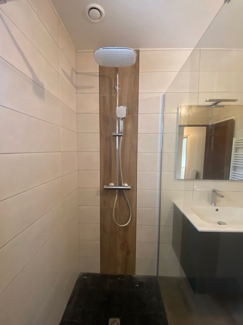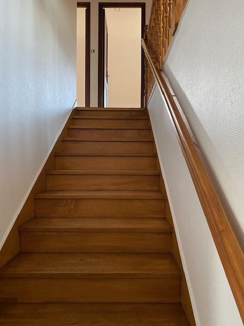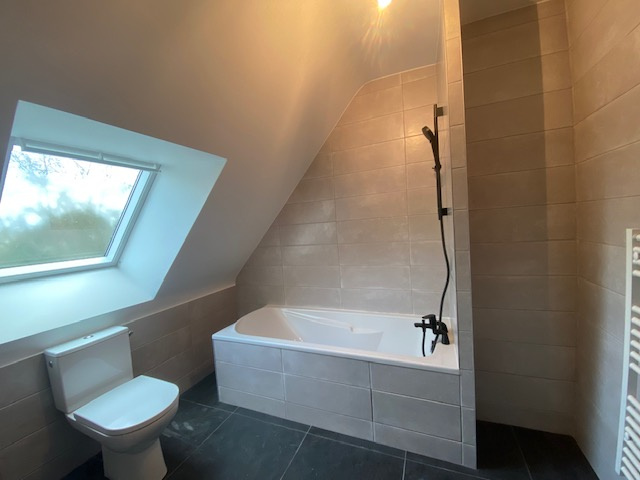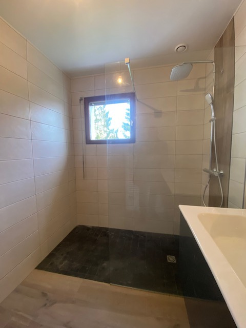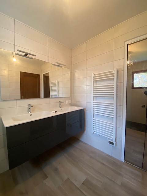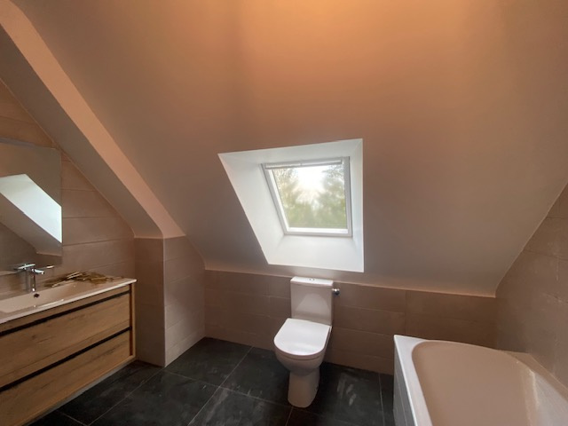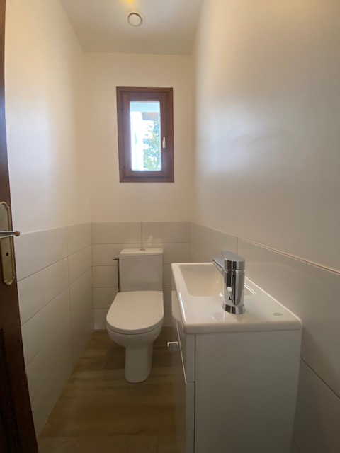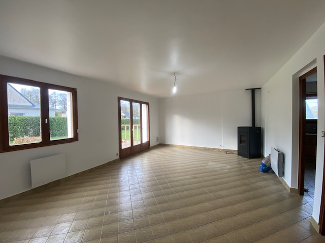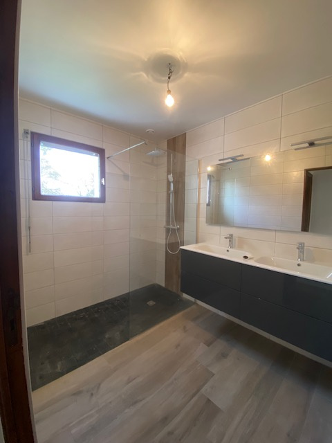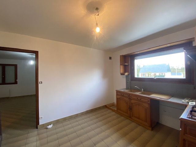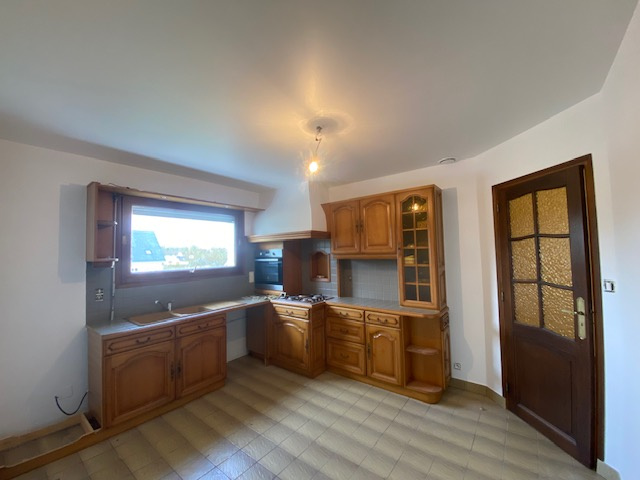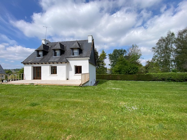 Maison à louer à SAINT-GONNERY (56), entre PONTIVY et LOUDEAC composée au sous-sol : cuisine d'été avec évier, couloir avec placards, garage deux voitures, une pièce avec cheminée ouverte et évier, cave ; au rez-de-chaussée : entrée, couloir avec placard, cuisine aménagée et équipée, séjour/salon avec poêle à pellets, couloir avec placard, une chambre avec placard, dégagement, wc avec lave-mains, salle de douche à l'italienne avec meuble double vasque et sèche serviette et placard ; à l'étage : mezzanine, couloir, trois chambres dont une avec placard, salle de bains/wc équipés avec meuble vasque, sèche serviette. Terrain attenant de 2029 m². Libre de suite.